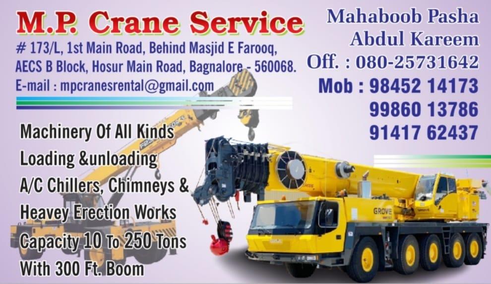 M P Crane Services is a trusted and professionally managed crane rental company offering complete lifting and material handling solutions across Bangalore, Karnataka, and South India. With years of industry experience, we specialize in providing reliable and high-capacity cranes for industrial, construction, infrastructure, and heavy engineering needs. We operate an extensive fleet of cranes rang...